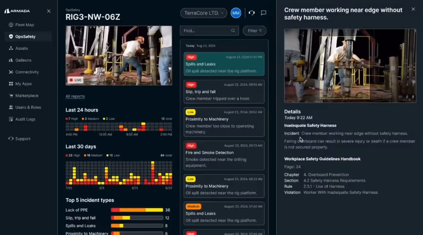 Atlas is the operational brain. It turns a fleet of remote assets into a manageable network. Starlink terminals and SD-WAN routers can be governed from a single console; data plans are pooled across terminals; traffic is shaped with QoS and bonded across satellite, LTE/5G, and terrestrial links. Performance and health are visible in real time. Enterprise features are standard: SSO with Entra/Okta/Google, role-based access controls, detailed audit logs, and a SOC 2/ISO 27001 security posture, with procurement available through Azure Marketplace. Atlas also extends into workloads, with dedicated modules for drone tracking and media management, long-horizon analytics for usage and reliability, and an AI Assist co-pilot for diagnostics, capacity planning, and predictive maintenance. Armada Marketplace is how software and devices flow to the edge without friction. Customers can deploy Armada’s own OpsAI applications, such as OpsSafety, Armada’s first-party AI application for real-time safety and incident prevention, which ingests camera and drone feeds to deliver live alerts and searchable context, from PPE compliance and restricted-zone breaches to fire detection and slip/fall risks. Other select partner offerings include SCADA or hyperspectral analytics, or ways to bring their own containerized services and push them to target sites in a few clicks. Connected assets—cameras, sensors, or terminals—can also be purchased and shipped pre-registered to AEP for zero-touch onboarding, enabling fleets to grow without creating operational sprawl.