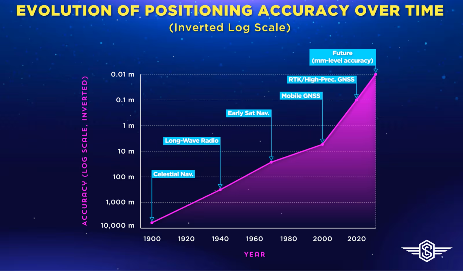 It maps navigation technology against accuracy thresholds and associated breakthroughs. From celestial navigation (kilometer-scale) to longwave radio (hundreds of meters), GPS (meters), and now AltPNT (centimeters and beyond), each leap in precision has unlocked new capabilities.