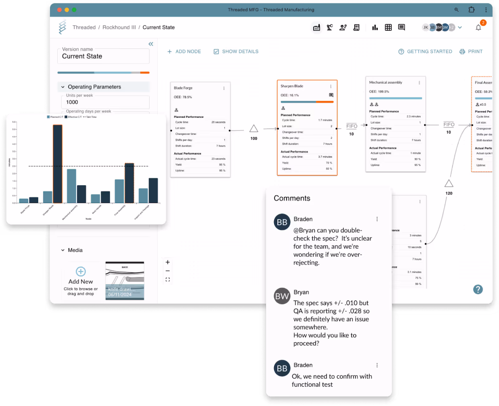 Teams can embed photos or videos of production stations and add comments to the map to show problems or suggest fixes. No more tedious monthly reviews. Threaded lets everyone, from shop floor operators to executives, see a live, updated view of the system.